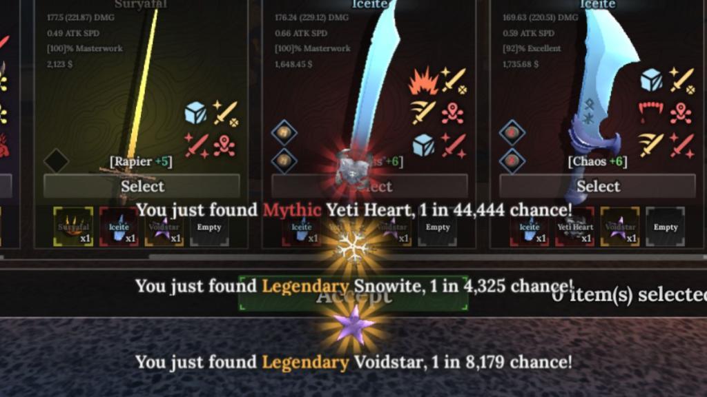 You can only recycle your crafted armors and weapons. And doing so will return you half the amount of ores used to craft that equipment. For example, if you have crafted a Straight Sword using six ores (2 Yeti Heart, 2 Void Star, 2 Snowite), you’ll get 3 of them back (1 Yeti Heart, 1 Void Star, 1 Snowite). However, if you are recycling equipment in which you have used one ore of each rarity; you’ll get back all the ores you’ve used. This happens only when you’re recycling Daggers, which typically require three ores.