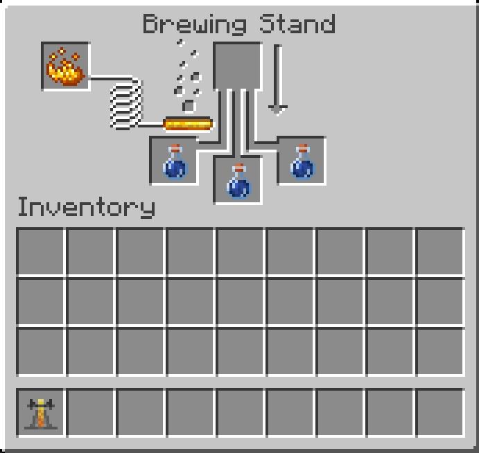 - Place the blaze powder in the leftmost slot and three water bottles in the bottom three slots after opening the Brewing Stand.