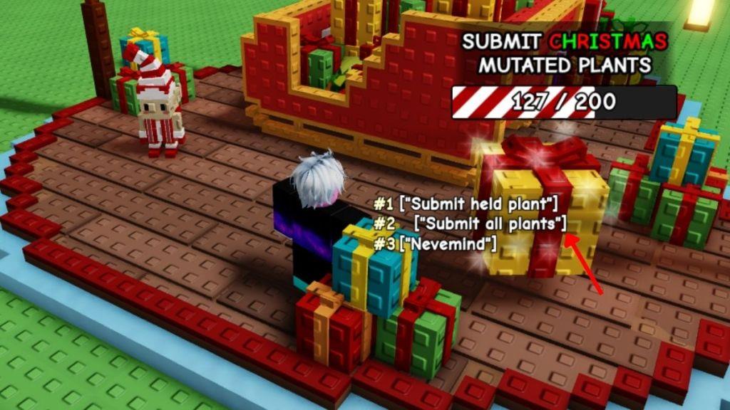 All you need to do is bring Christmas mutated plants to the Present NPC and submit them. Every 10 minutes on average, a Christmas-themed weather event happens on the server and gives your plants the required mutations.