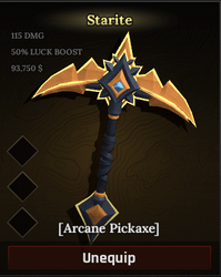 The Arcane pickaxe sits behind a locked zone, so you need to return Bard’s Guitar to earn the Unknown Key. Use that key to open the Fallen Angel’s Cave, and you can buy the pickaxe for $125,000. Even though it costs less than Magma, it delivers better mining speed, far better luck, and room for three runes. It works as the ideal pickaxe to carry you toward the Demonic pickaxe or whatever new tool arrives next.