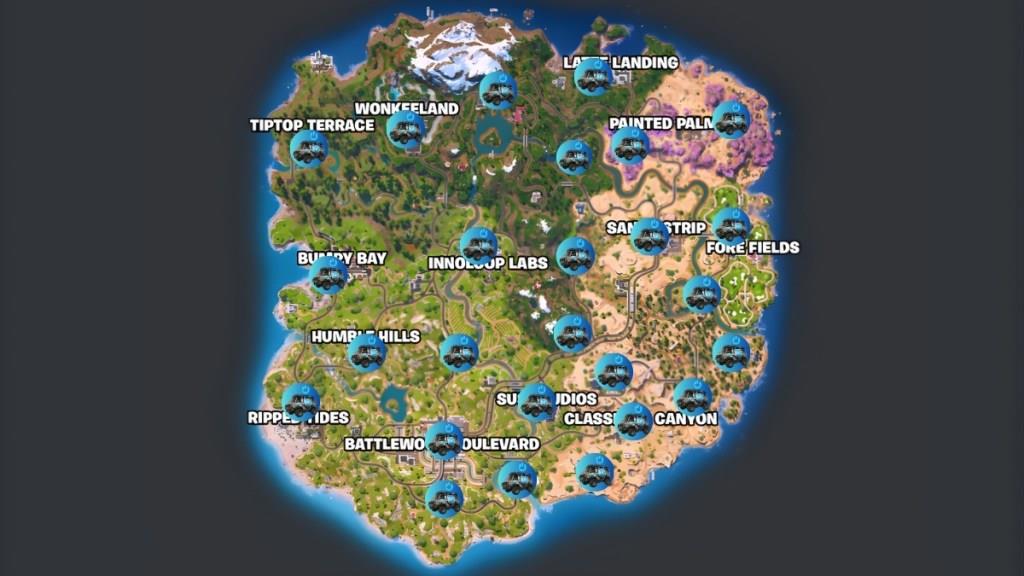 Drivable Reboot Vans spawn randomly across the Fortnite Chapter 7 Season 1 island. However, we’ve narrowed down the locations on a detailed map below where you may come across a drivable Reboot Van.