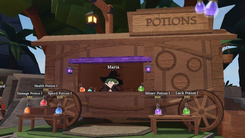 Maria’s Potion Shop is located on the right side of the Forging Station. You can find Maria NPC in her cart, selling various potions.
