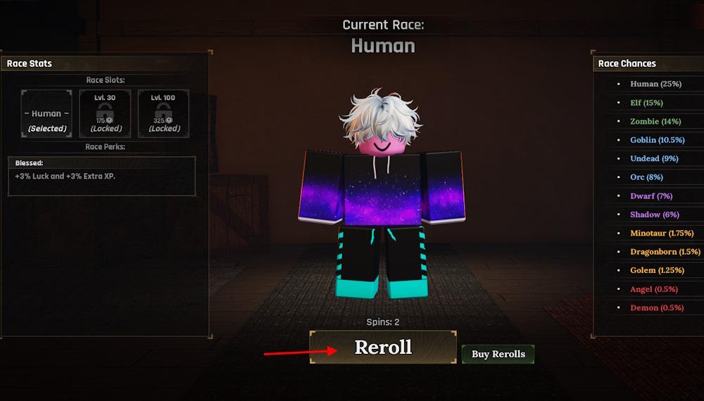 - Click the Reroll button to roll for the race you desire.