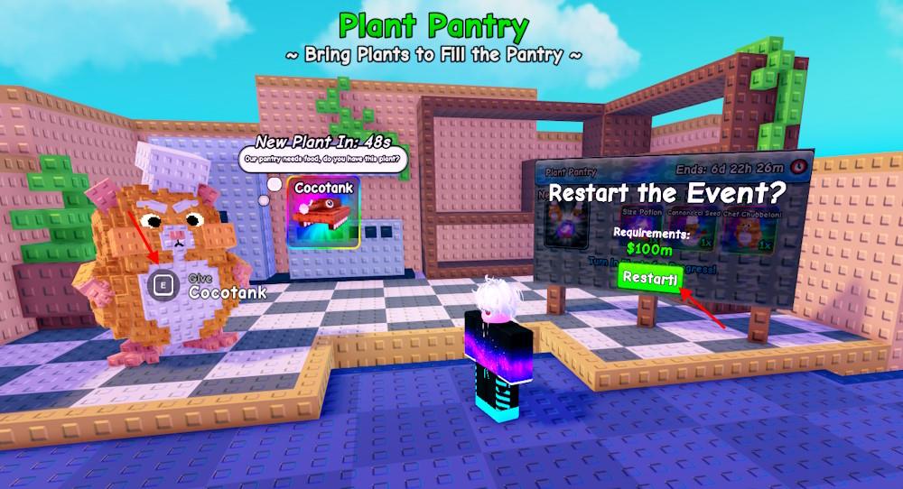 Repeat the steps multiple times, and submit the required plants until the progress bar is 100%. Completing it will reward you with a Size Potion, a Cannonocci Seed, and a Chef Chubbeloni. You can restart the event by spending $100M and continue collecting the new rare Brainrots.