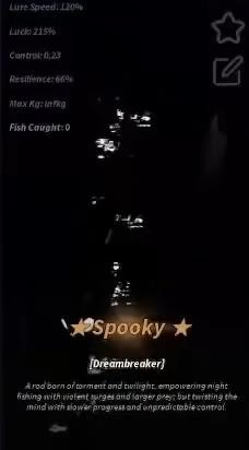 The Dreambreaker Rod in Fisch boasts Lure Speed at 120%, Luck at 215%, Control at 0.23, Resilience at 66%, and infinite Max Weight with no cap. It belongs to Stage 11 as an end-game rod. Daytime passive cuts fish size by 50% and gives a 25% chance for the Distraught mutation that multiplies value by 16.3×, plus 15% base progress speed; nighttime boosts fish size by 50%, raises Distraught chance to 35%, and adds a 33% slash chance every 0.25 seconds for 5% progress.