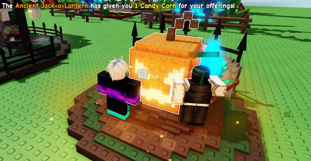 Jack-O-Lantern is a limited-time NPC that appears during the Halloween event in Grow a Garden. Players can find him near the pumpkin patch at night, surrounded by glowing lanterns. He exchanges Candy Corn currency for spooky items such as decorations, seeds, and costumes. Interacting with him daily can reward players with special event bonuses or rare collectibles tied to the seasonal theme.