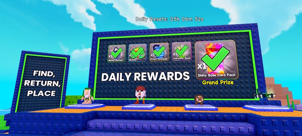 The daily rewards are the best way to collect card packs in Plants vs Brainrots. You must place the required brainrots on the platform to get all the rewards. As the final reward, you will get a shiny card pack in Plants vs Brainrots. You will also earn some valuable Plants vs Brainrots gears from these daily rewards.