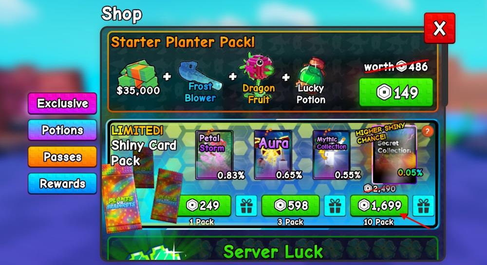 Don’t want to grind for the cards? You can purchase the Plants vs Brainrots cards by using Robux in the game shop. In the shop, 1 pack costs 249 Robux, 3 packs cost 598 Robux, and 10 packs cost 1699 Robux.