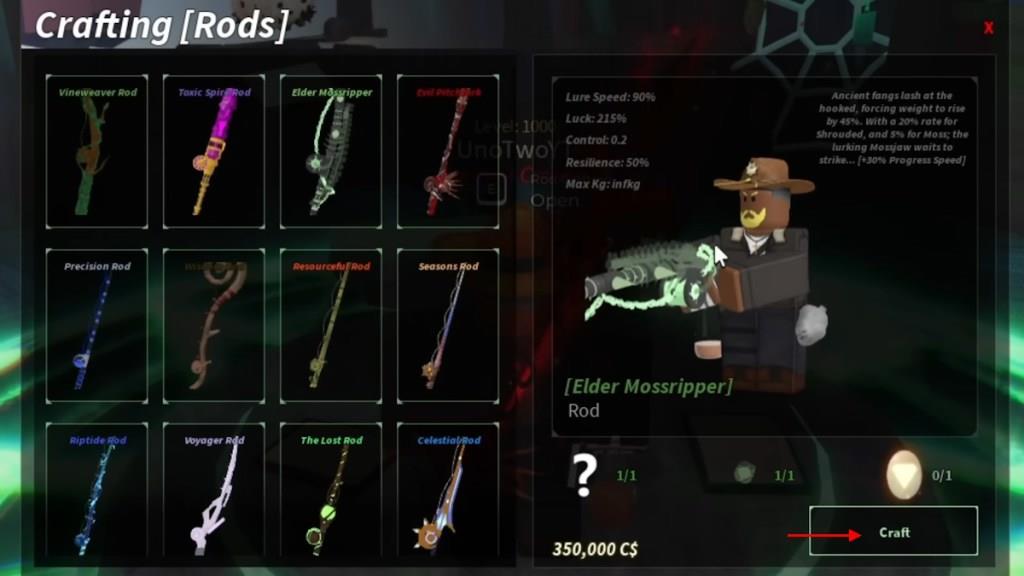 Once inside the archives, walk toward the Crafting Anvil at the end of the room. Hold the ‘E’ key to open the crafting rods menu. Select the Elder Mossripper Rod and click the Craft button to obtain it in Fisch. You will also need 350,000C$, along with the crafting materials.