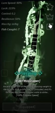 The Elder Mossripper Rod offers Lure Speed of 90%, Luck at 215%, Control of 0.2, Resilience of 50%, and infinite Max Kg capacity. Its passives grant a 45% weight increase to caught fish, a 20% chance for Shrouded mutation, and a 5% chance for Moss mutation. Players also receive +30% Progress Speed during Mossjaw strikes.