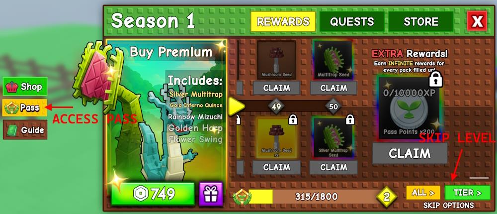 As you progress through the battle pass in Grow a Garden, you will earn Pass Points. Remember, the season pass quests are the only way to obtain them. Once you have Pass Points, you can spend them in the Grow a Garden Season Pass store. You can click the store button within the pass to access it.
