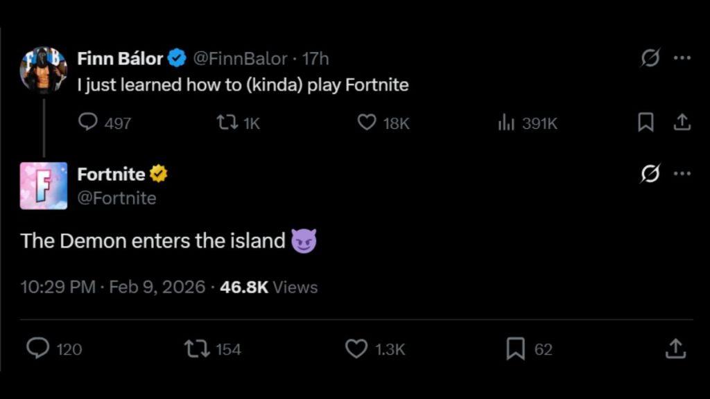 The hints towards the collab come from Twitter channels, with the game’s X page interacting with one of Finn Balor’s posts and stating, “The Demon enters the Island,” referring to the wrestler’s iconic Demon persona. The statement, while not exactly a confirmation, heavily implies that the Fortnite x Finn Balor collaboration is on its way.