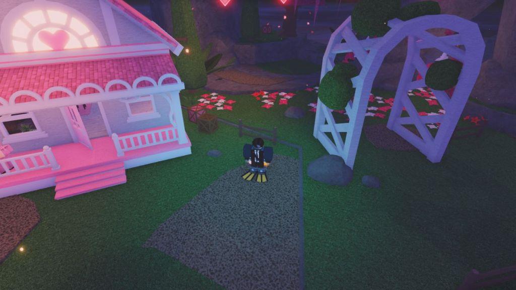 - Here, you will find a pink heart with an NPC named Valen standing on the porch.