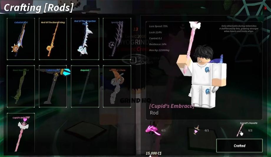 Once inside the archives, walk toward the Crafting Anvil at the end of the room. Hold the ‘E’ key to open the crafting rods menu. Select the Cupid’s Embrace Rod and click the Craft button to obtain it in Fisch. You will also need 15,000C$, along with the crafting materials.