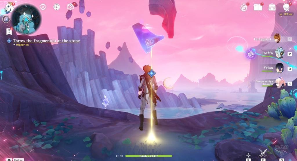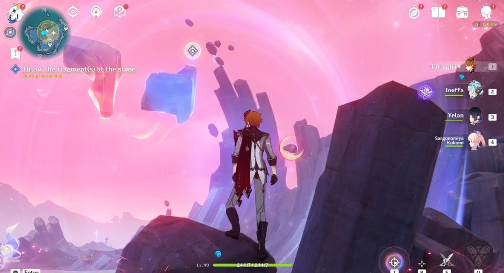 Pick up the fragments from the Moon Mirror one by one and throw them at the large Stone Pillar inside the force field. This will break the force field and make the Stone connect to the massive pillar in the air. Doing this will complete the quest.