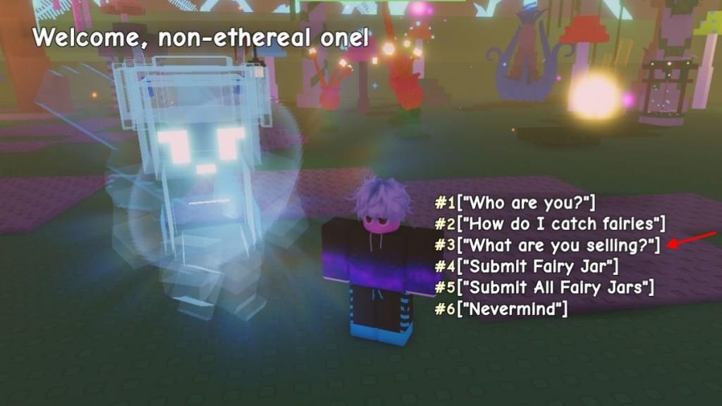 This NPC looks similar to the Glimmering Sprite pet introduced in the last update, except for its transparent look. Move close to the NPC, and interact with it. Now select the same “What are you selling?” dialogue option to check the catalog. Here’s all you will find at the Lumina Fairy Fares Shop:
