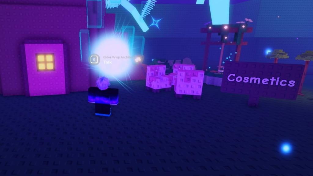 There’s a third Elder Wisp in the Fairy World as well. You will find it at the end, in front of a small hut. Look for the cosmetics banner, and to its left will be the Elder Wisp Architect NPC. Walk up to the blue glowy orb, interact with it, and select the dialogue to display the shop items.