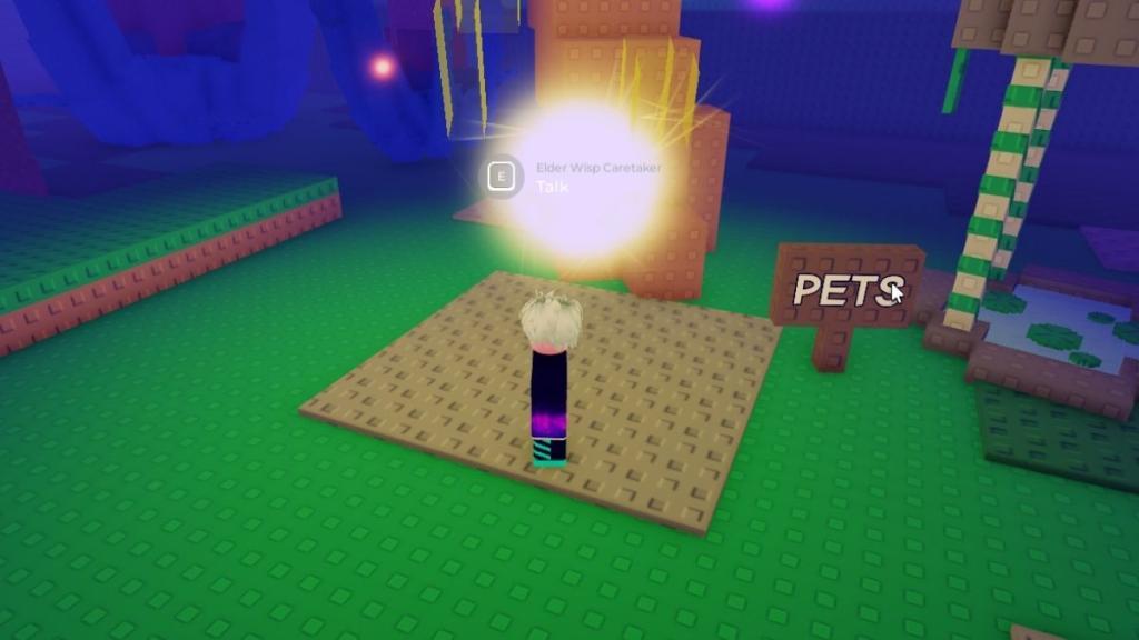 Behind the massive tree, if you walk straight to your right rather than going to your left, you’ll find a golden glowy orb behind the pet’s banner. Press the E key and select the option to display the shop items. So, here are all the items you’ll find in the Elder Wisp Caretaker shop: