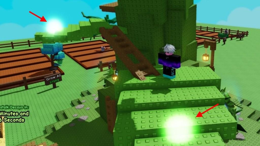 Once the requirements are met and the beanstalk grows to the clouds, you can earn your rewards by interacting with the glowing orbs while completing the obby by climbing the beanstalk.