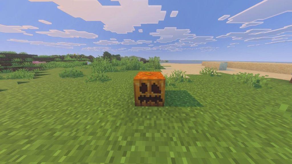 - Right-click on the pumpkin using a shear to add an eye hole and a mouth to it, thereby making it a carved pumpkin.