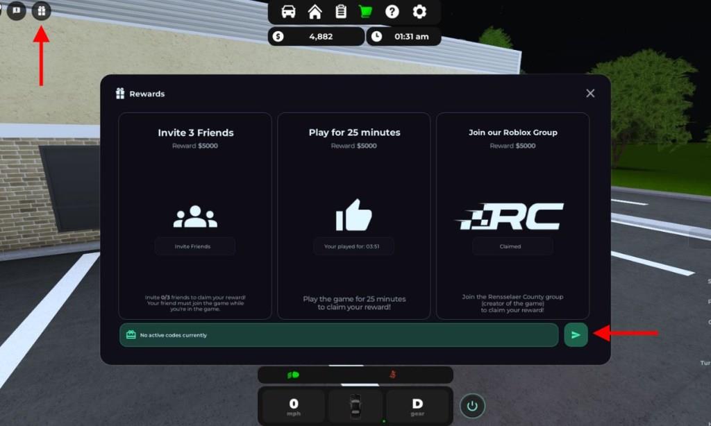 Look at the top-left corner of your screen for a row of buttons or icons; the gift box, present, or “Rewards” icon (often the last one) appears there once loaded. Simply click or tap it directly-no additional prerequisites like jobs or vehicles are needed beyond basic spawning. This opens the Rewards menu with tabs like “Task” and a code entry field at the bottom.
