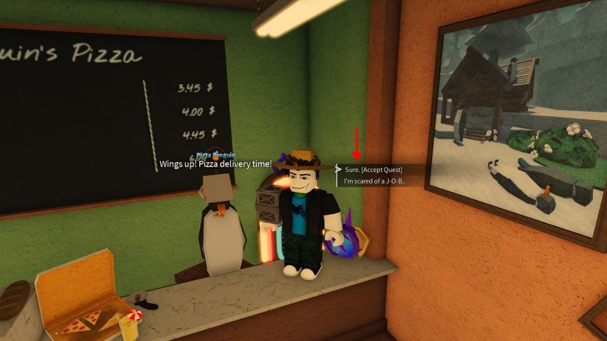 Once you are at the Penguin’s Pizza shop, go inside and interact with the Pizza Penguin NPC by pressing the E key. Select the ‘Accept Quest‘ option to take on the delivery job and start the Pizza Delivery quest. Then, open your map, find the colored waypoint marking the penguin customer’s location, head there, and deliver the pizza.