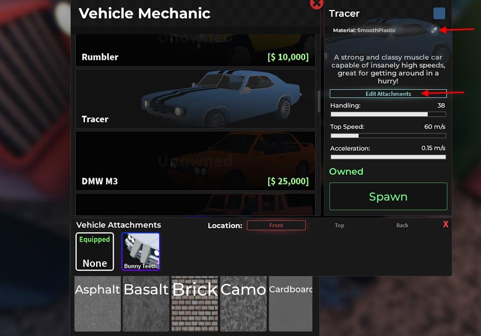 To add or remove attachments, click the Edit Attachments option. This will let you add or remove Top, Front, and Back attachments to your car. Moreover, you can buy the Car Materialsgamepass on Dig for 99 Robux to unlock the material feature.