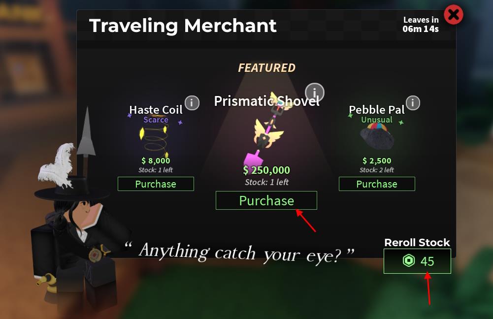 Before purchasing, you can click the ‘i’ button to check the stats of the items. These items have a limited stock, so if you want something, you’d better hurry. If you’re not happy with the selection, you can reroll the merchant’s stock for 45 Robux.