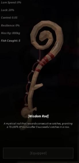 Having collected these items, spend 50,000 cash, use the above-mentioned items, and the Wisdom rod will be all yours. This rod’s passive ability gives you a 70-100% XP bonus on every catch after 5 successful catches. Having said that, let’s look at the stats of the Wisdom rod: