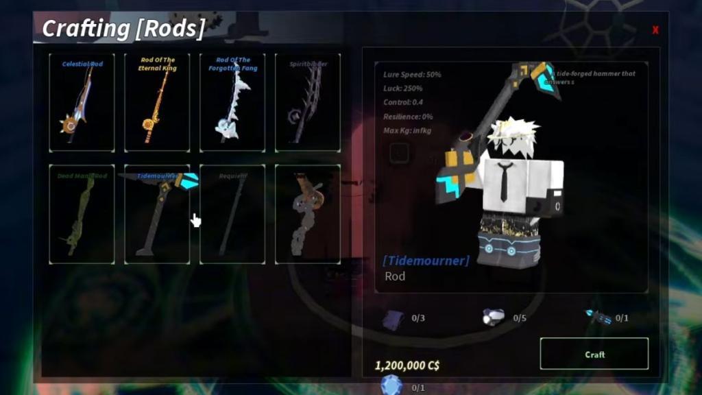 Once inside the archives, walk toward the Crafting Anvil at the end of the room. Hold the ‘E’ key to open the crafting rods menu. Select the Tidemourner Rod and click the Craft button to obtain it in Fisch. You will also need 170,000C$, along with the crafting materials.