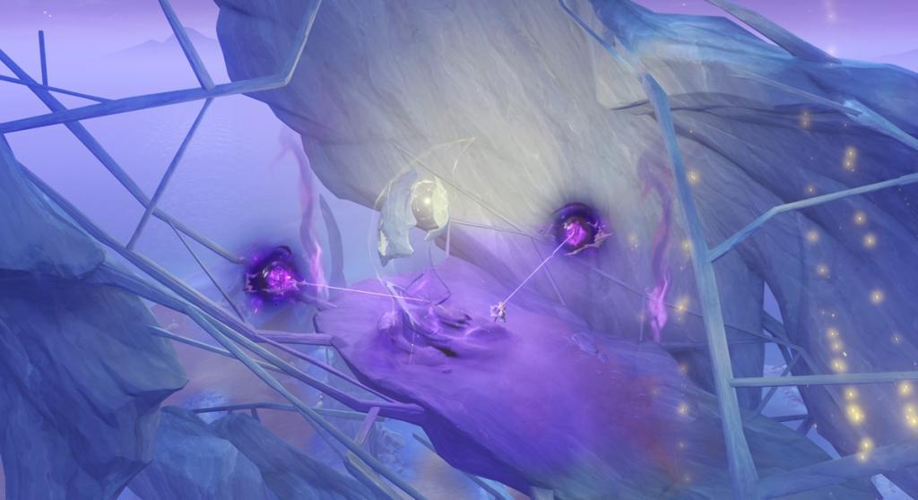 Now, head to the middle quest mark and use the kuuvahki plant’s power to cut the abyssal threads as mentioned above. Collect the nearby broken particle and shoot it at the core to put it into place. This will spawn abyssal enemies. Defeat them to head to the next segment. Now, more abyssal threads will appear that you will have to cut down using the power of kuuvahki. Next, find the core piece behind it and put it into place using the same method.