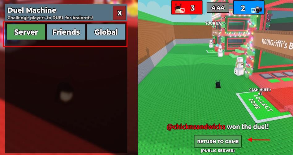 The duel follows a best-of-five format. The first player to steal the opponent’s Brainrot three times wins the match. After the duel ends, players can either leave or return to a public server. Leaving is recommended, as returning makes you vulnerable to being stolen immediately.