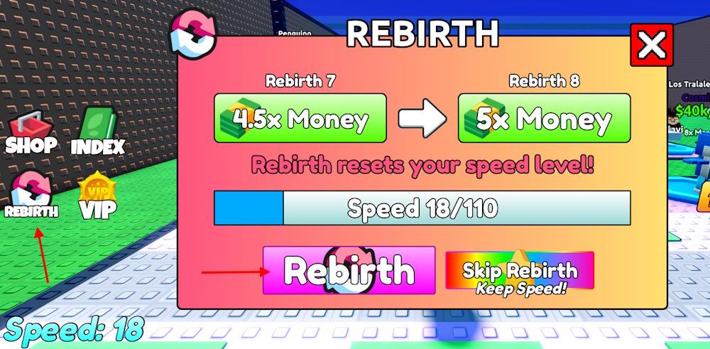 Rebirthing is most useful once you hit the required Speed comfortably and have a few strong Brainrots generating a steady income. Early rebirths may feel slow, but higher rebirth levels quickly snowball your progress and make Speed upgrades far easier to afford. If you are struggling at a specific level, the Skip Rebirth gamepass is an option, but it is not necessary for steady progression.