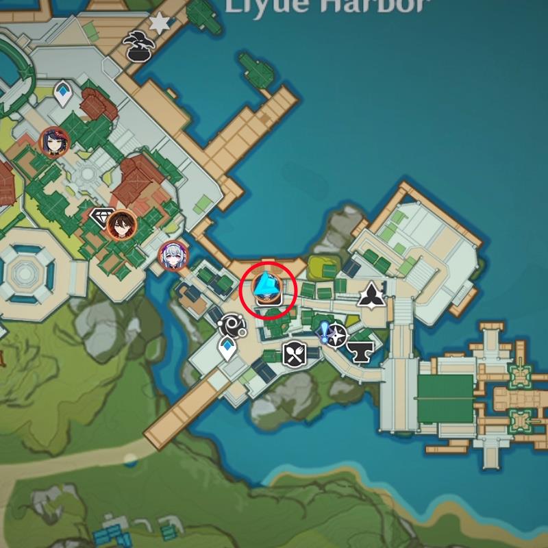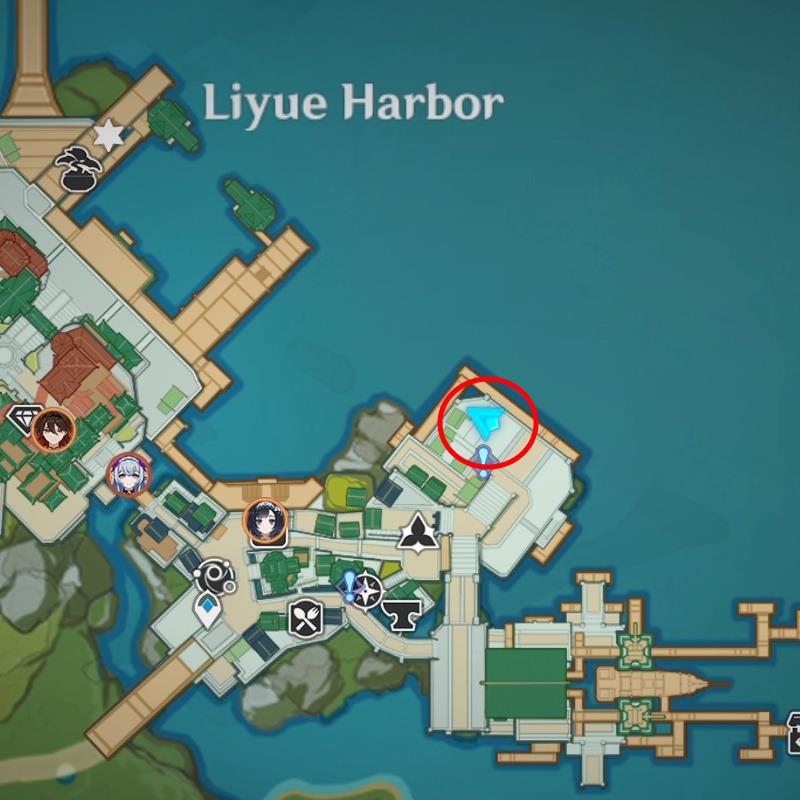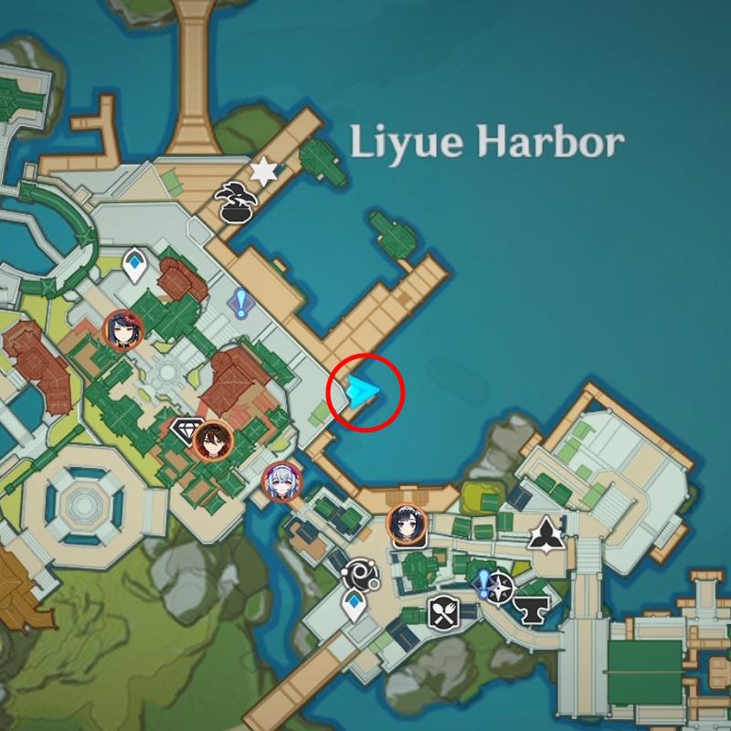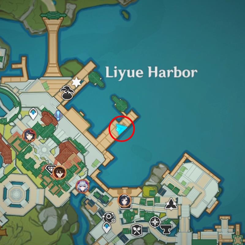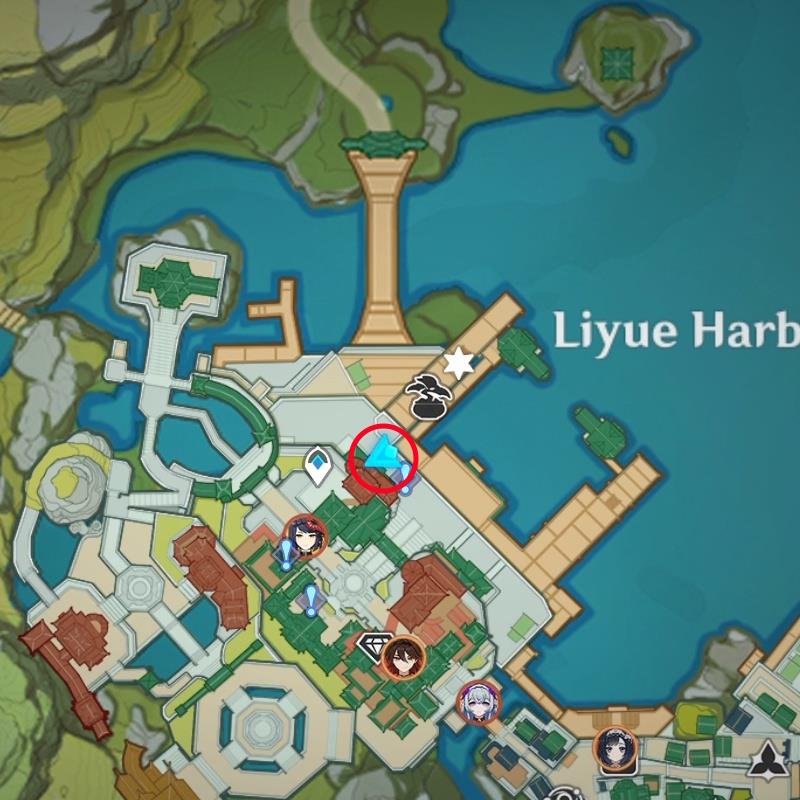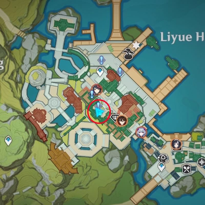 Open the in-game map, zoom fully into Liyue Harbor, and use these landmarks (bulletin board, toy shop, wharf, reputation board, etc.) as anchors, then walk a small circle around each.
