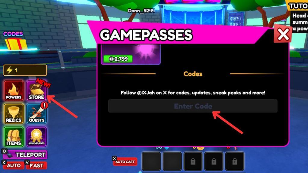 To open the in-game store and find the Codes box in Anime Card Adventures on Roblox, start by launching the game and joining a server. Locate the Store button on the left side of the screen, click it to open the menu, then scroll down past gamepasses to reveal the code input box at the bottom.