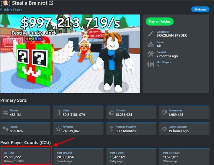 October pushed things even further. Steal a Brainrot peaked at 25.8 million CCU, a number that alone would qualify as a platform. That surge dragged Roblox to a record-breaking 47.4 million users online at once. One experience was responsible for more traffic than the entire national population. If Grow a Garden broke the record for the first game ever to reach 20 million concurrent players, Steal a Brainrot took that bar to the stratosphere.