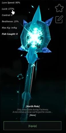 Apart from the decent stats on this rod, there are some passive abilities you will love to try out. While using the North Pole Rod, you have a 35% chance for Permafrost (10x) mutation. On top of that, the rod gives a 24% chance per fish movement to stab for 15% progress and a 50% Forced Progress Speed whilst the fish is in the bar.